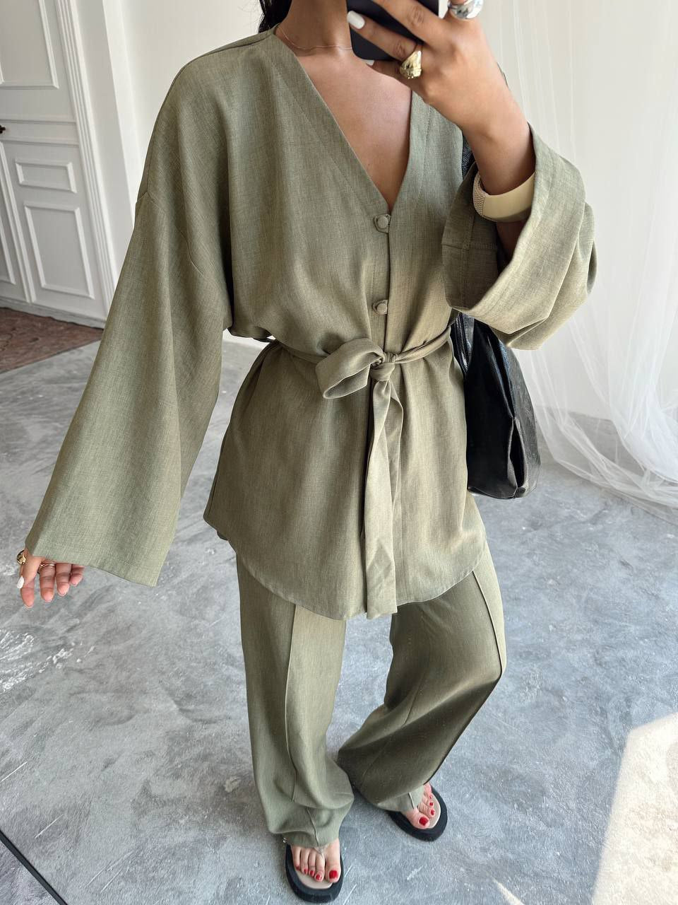 Dieser Zweiteiler bringt mühelos Eleganz in den Alltag: Edle Farben, eine fließende Silhouette und raffinierte Details sorgen für einen Look, der modern, feminin und zugleich unglaublich bequem ist.